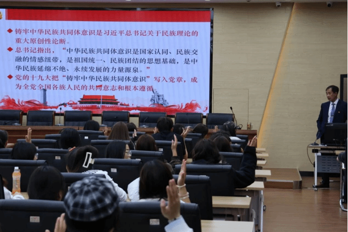 讲座中,屈原书记结合历史与现实、理论与实践,从中华民族共同体的形成历程、铸牢中华民族共同体意识的重大意义、新时代青年如何践行民族团结使命三个方面进行了系统阐述。他用生动的案例讲述了各民族在长期历史进程中相互依存、休戚与共的动人故事,强调QY千亿球友会作为人才培养的重要阵地,要始终将民族团结教育融入教育教学全过程,引导广大员工树立正确的国家观、历史观、民族观、文化观、宗教观,增强 “五个认同”。